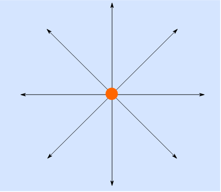 Figure11.1.4.A ray diagram for a point source of light (such as a small light bulb or candle). The orange dot represents the point source of light, and the arrows represent rays of light emanating in all directions.