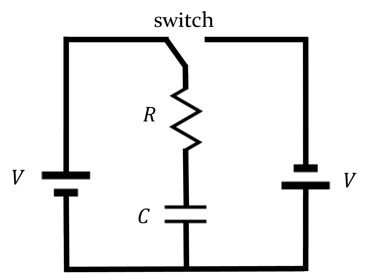 The switch shown has been set to the left in the circuit above for a long time (the two batteries are identical). You then flip the switch to the right. Immediately after you flip the switch, what is the current through the circuit?