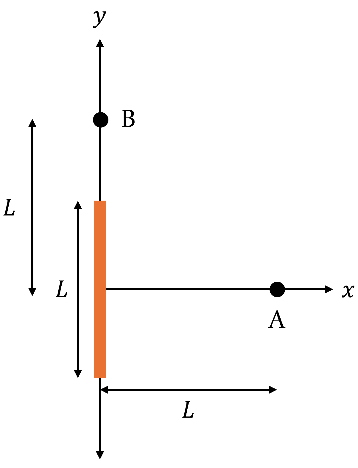 The wire shown above has its middle located at the origin. The wire has length \(L\) and a non-uniform charge density \(\lambda = \frac{q_o y}{L^2}\text{.}\)