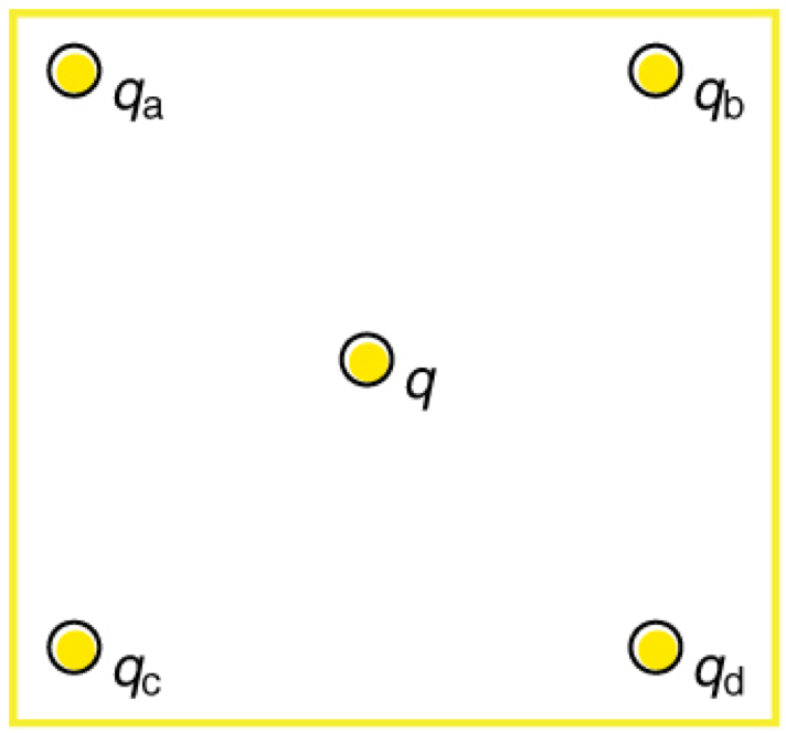Three straight wires (with one end at \(x = –L\) and the other end at \(x = +L\)) each have the same total charge \(+Q\) distributed differently. Wire A has charge density \(\lambda_A(x) = +\alpha x^2\text{.}\) Wire B has charge density \(\lambda_B(x) = +\beta \cos\left(\frac{\pi x}{2L}\right)\text{.}\) Wire C has uniform charge density \(+\lambda_C\text{.}\)