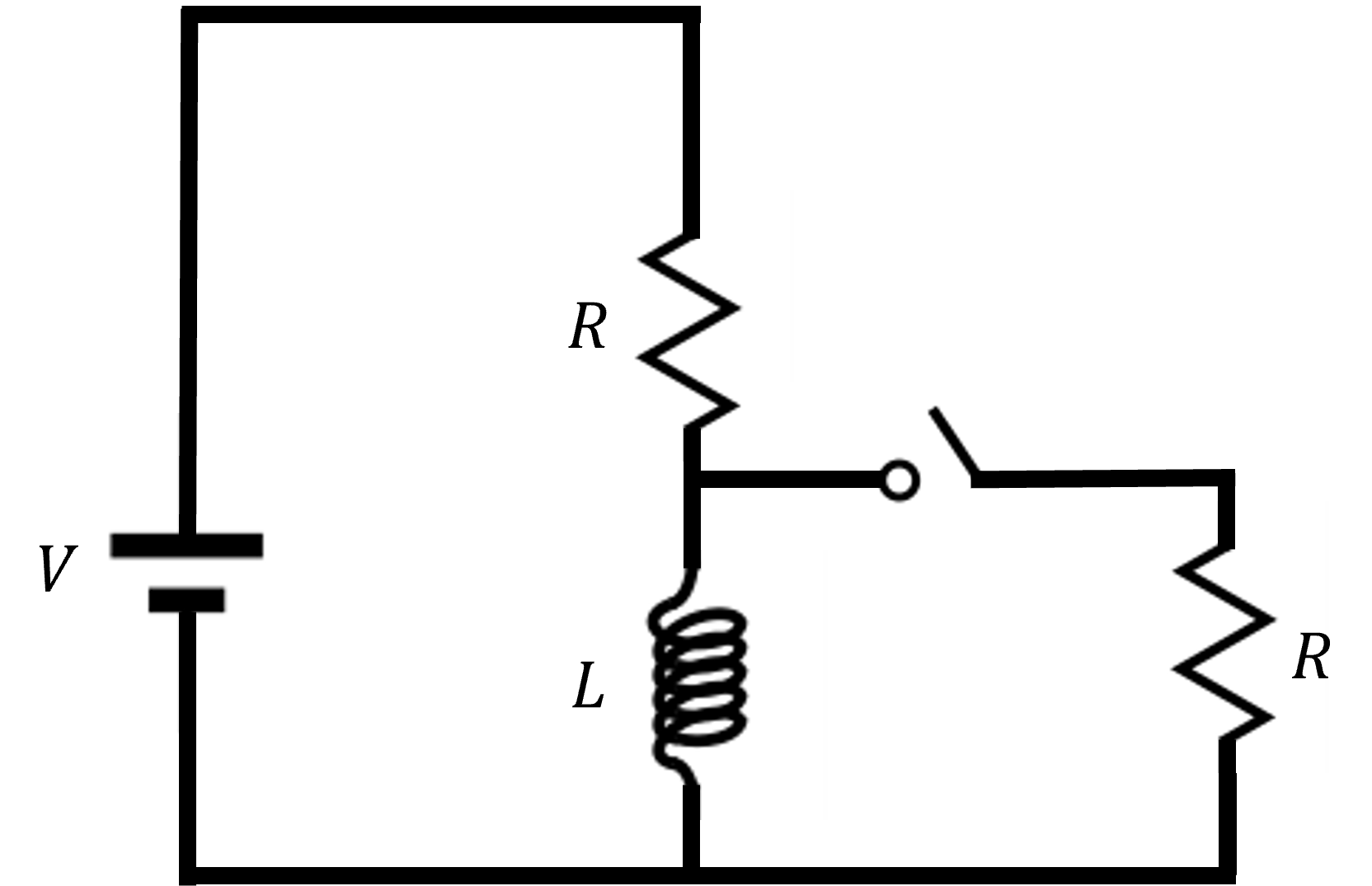 Shown below is a circuit with an ideal battery, a linear resistor, and an ideal inductor. This circuit has been connected for a very long time (with the switch open), and you measure the current through the inductor to be \(I_A\text{.}\) At time \(t_1\text{,}\) you close the switch. You then wait a long time and measure the current through the inductor to be \(I_B\text{.}\) Is \(I_B\) greater than, less than, or equal to \(I_A\text{?}\)