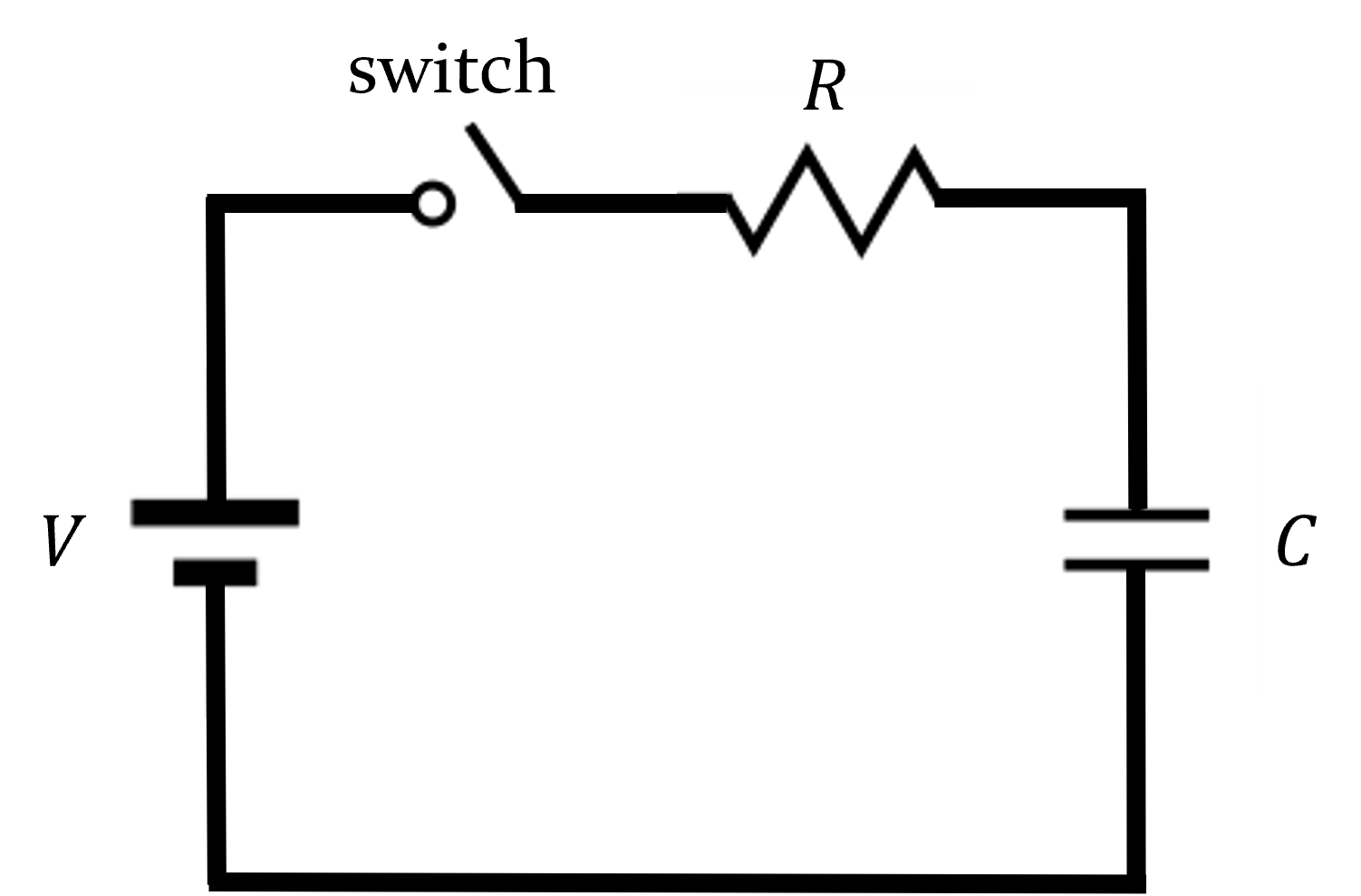 The circuit below contains a battery, a resistor, a switch, and a capacitor. The capacitor is initially uncharged and the voltage of the battery is \(V\text{.}\)